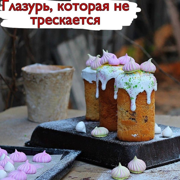 Глазурь, которая не трескаетсяСахар. пудра — 150 гр. Вода — 60 мл. Желатин — 5 гр. Показать полностью…Сок лимона — 1/3 ч.л. ? Желатин замочить в половине воды по рецепту (30 мл.) для набухания. В сотейнике довести до кипения сахарную пудру с остальной водой. Постоянно помешивать. ? Перелить полученный сироп в миску. Добавить набухший желатин. Хорошо перемешать. Взбивать миксером до побеления и загустения. В конце взбивания добавить лим. сок. ? Глазурь застывает быстро, поэтому можно поставить миску с глазурью на другую миску с горячей водой. Сразу наносить на остывшие куличи и сразу оформлять посыпкой или другим декором. ? Если глазурь все-таки застыла и вы не успели обмазать все куличи, можно её прогреть.Всего вам самого вкусного!